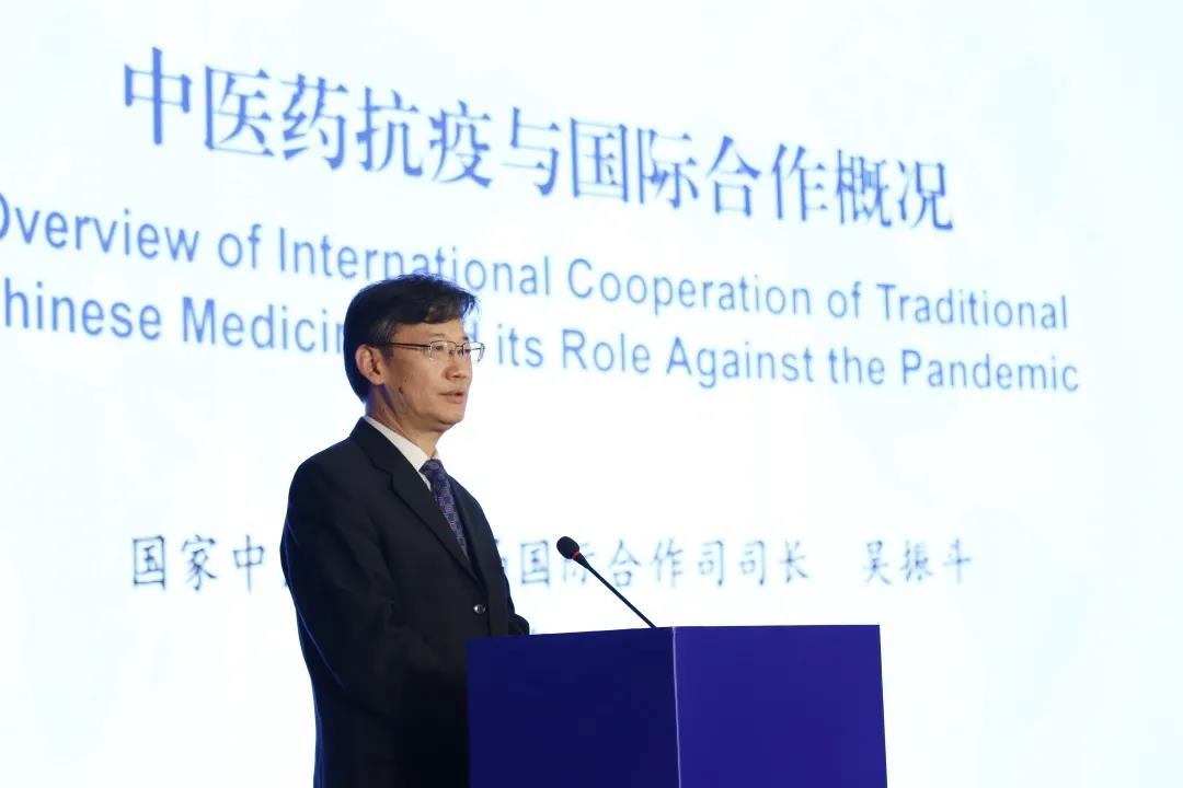 在特邀报告环节,国家中医药管理局国际合作司司长吴振斗,从中医药国际交流与合作现状、中医药深度参与新冠肺炎疫情防控、与国际社会分享中国经验方案、做好顶层设计构建人类健康共同体四个方面,做了专题报告。